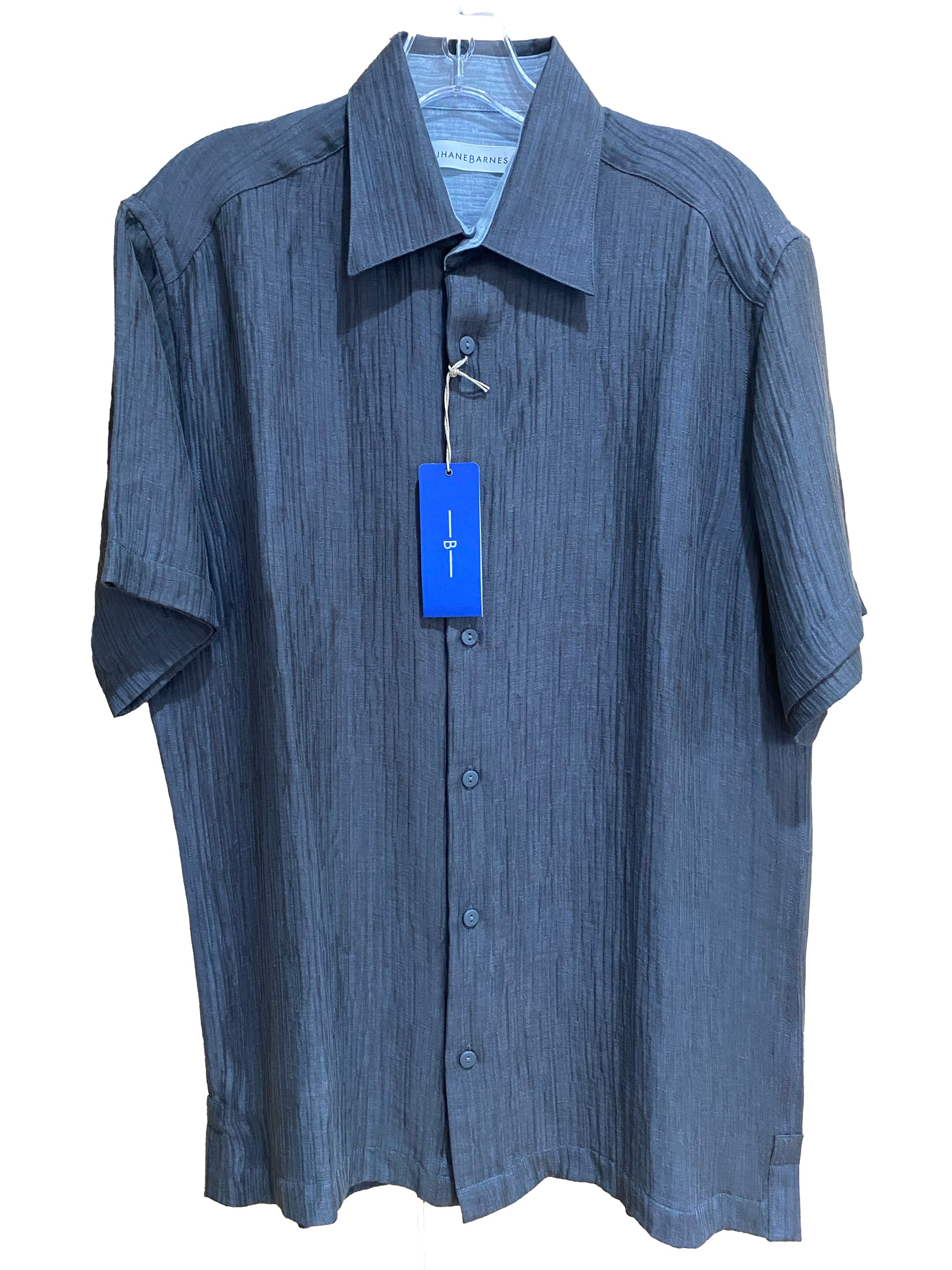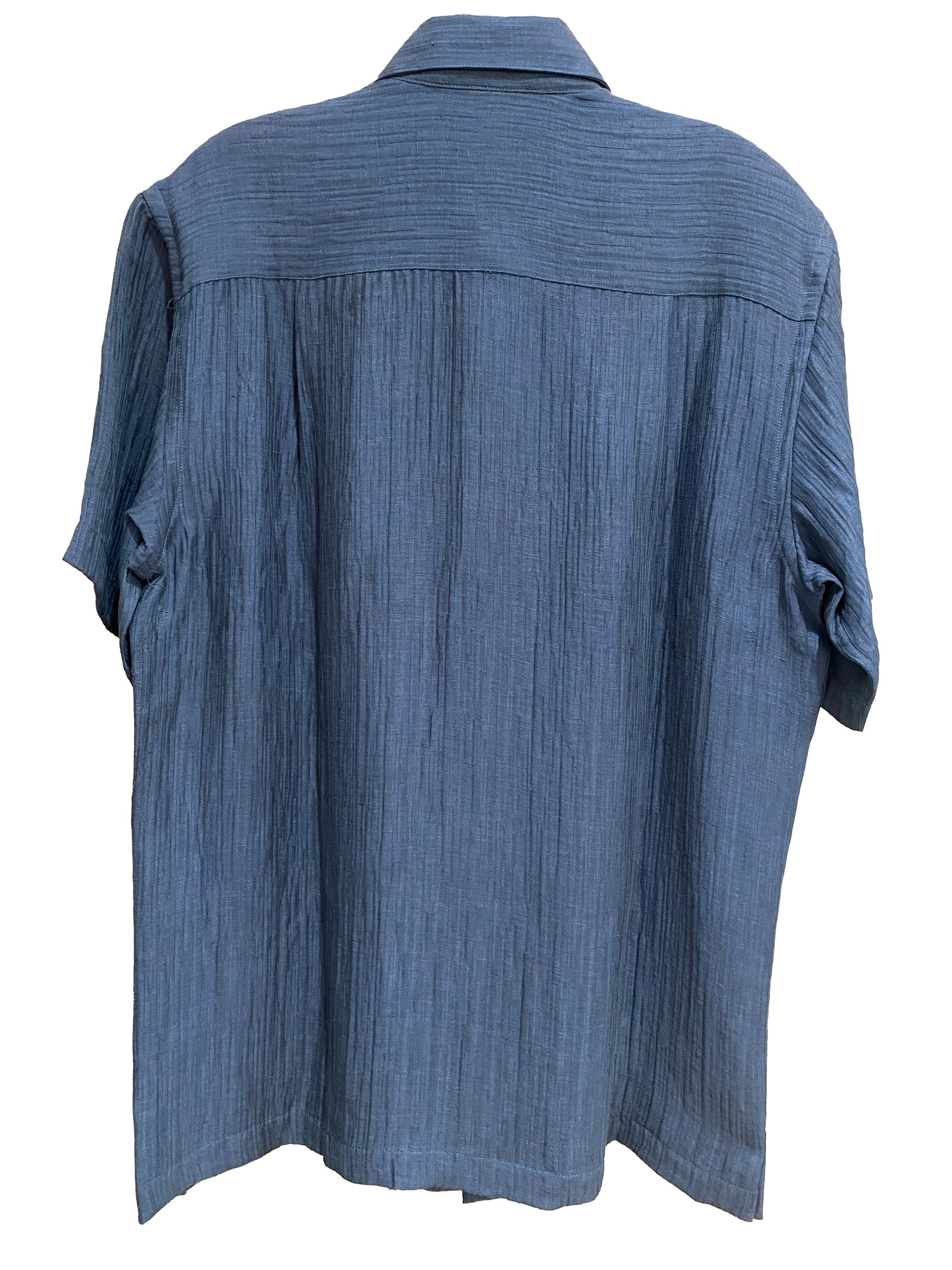 Style is French front, short sleeve, regular collar; buttons dyed to match. straight bottom with side vents and back yoke, for ease of movement.
