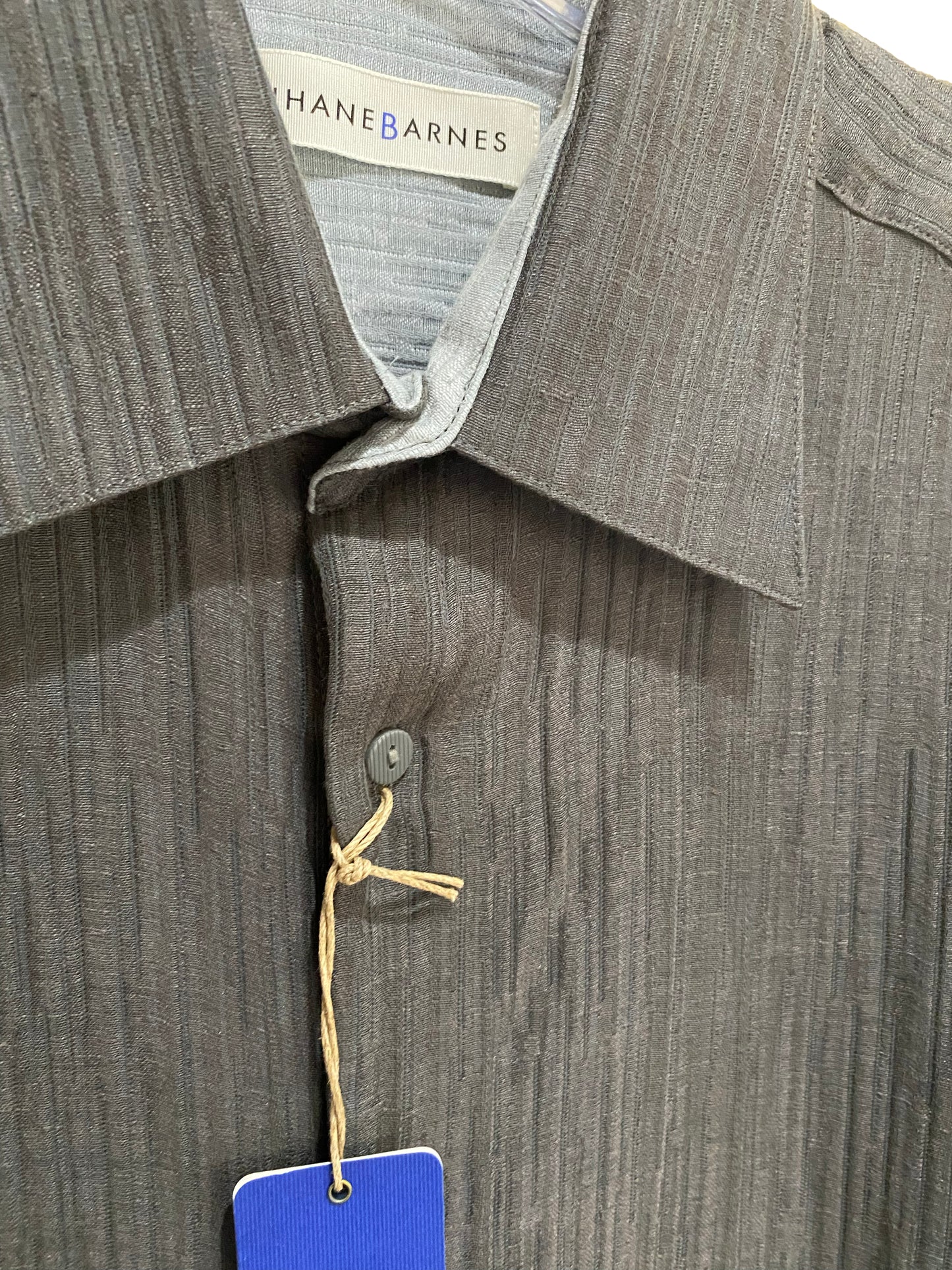 SIZE : SMALL LABEL (NOTE: Boxy-straight bottom edge with side vents, drapes nicely to confirm body; may fit between a size Small and Medium if worn without buttoning collar-band as pictured)